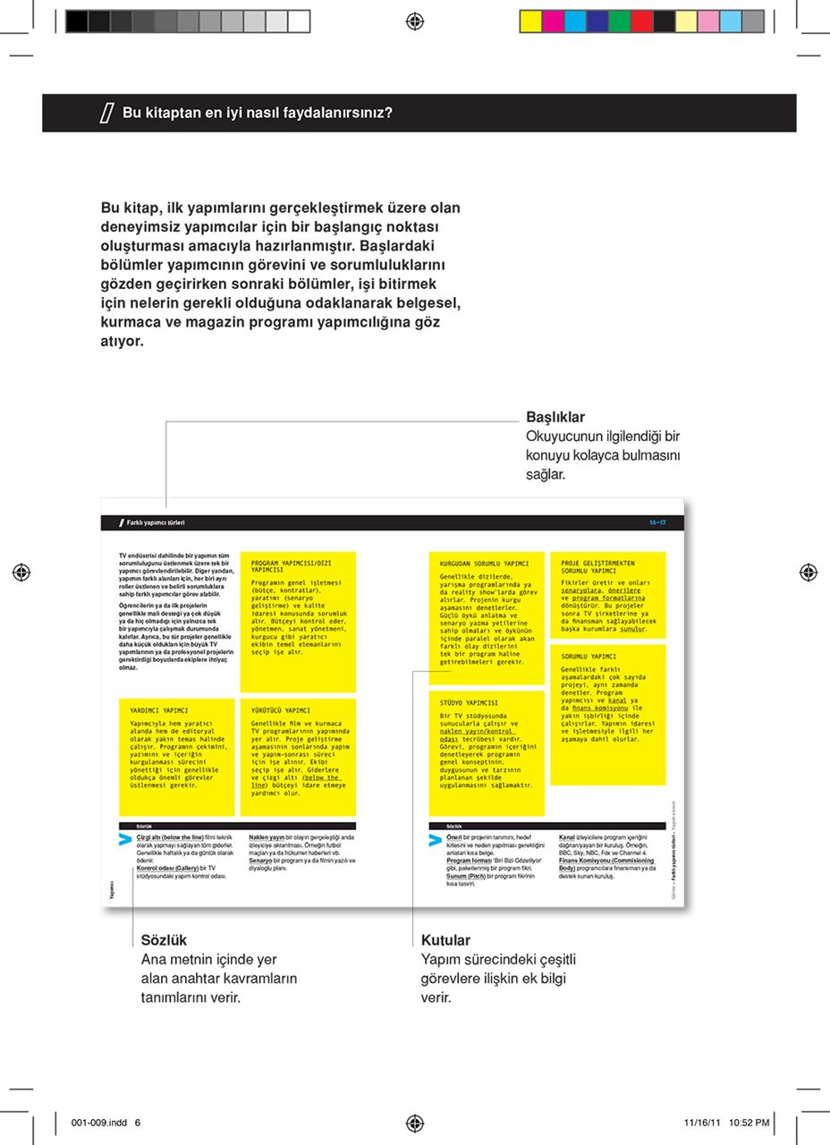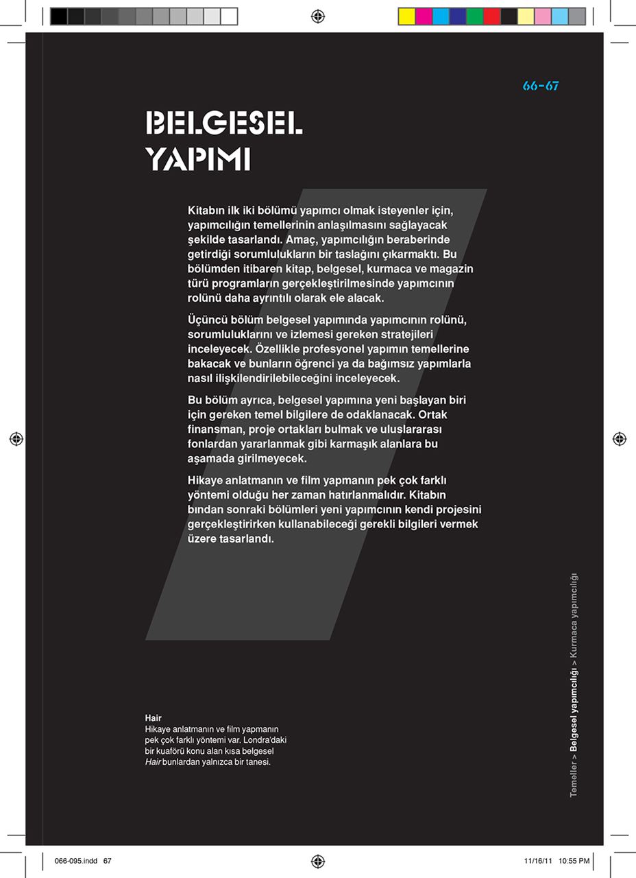 Film Yapımı Temelleri: Yapım, sinema-tv dünyasına dahil olmak isteyenler için gerekli olan temel bilgi ve becerileri belirleyerek, öğrenci ve yapımcı adaylarını kurmaca, belgesel ve magazin programı yapımcılığı dünyasıyla tanıştırıyor.